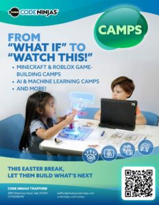DESCRIPTION: Spring holidays are just around the corner, and we’re excited to invite your Ninjas to our Spring Holiday Tech Camps at Code Ninjas Trafford! We’ll be running a range of fun, hands-on camps where kids can build games, explore technology, and develop future-ready skills.