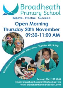 We have an open day coming up on Wednesday 15th October. Parents can book a slot by visiting the admissions page of the school website St Vincent’s Catholic Primary School Trafford: Admissions.