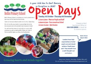 Open Days: Tuesday 7th October, Thursday 6th November. Open morning start time is 9:10am
